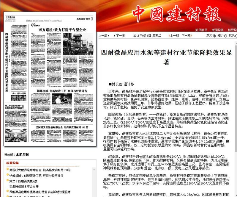 近年來,微晶材料在水泥等行業裝備領域的應用正在逐步推進。晶牛集團的四耐微晶的晶核材料高強耐磨耐急冷急熱的性能已經在河北、山西、安徽等省份的水泥行業粉磨系統襯板、篦冷機側壁、預熱器筒體、掛件、閘板、溜槽、稱量漏洞、立磨三道鎖風閥等成功試用兩三年,并取得很好效果:壓縮了操作工藝程序;提高了設備壽命;降低了能耗;避免了安全事故發生。