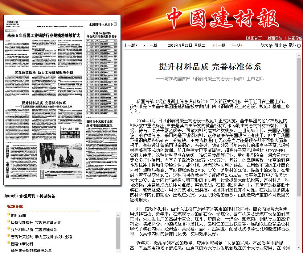 我國《鋼筋混凝土筒倉設計標準》不久前正式實施,并于近日在全國上市。該標準是在由晶牛集團壓延微晶板材做內襯的《鋼筋混凝土筒倉設計規范》基礎上修訂的。