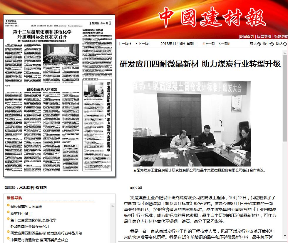 我是煤炭工業(yè)合肥設計研究院有限公司的高級工程師,10月12日,我應邀參加了《鋼筋混凝土筒倉設計標準》頒發(fā)儀式。這是今年8月1日開始實施的一部事關各類料倉、農(nóng)業(yè)糧食建設的國家新標準。晶牛微晶集團公司編寫的《工業(yè)用微晶板材》行業(yè)標準,成為此標準的具體參照,晶牛自主研制的壓延微晶新材料,可作為筒倉內襯材料替代不銹鋼、鑄石、高分子聚乙烯等。