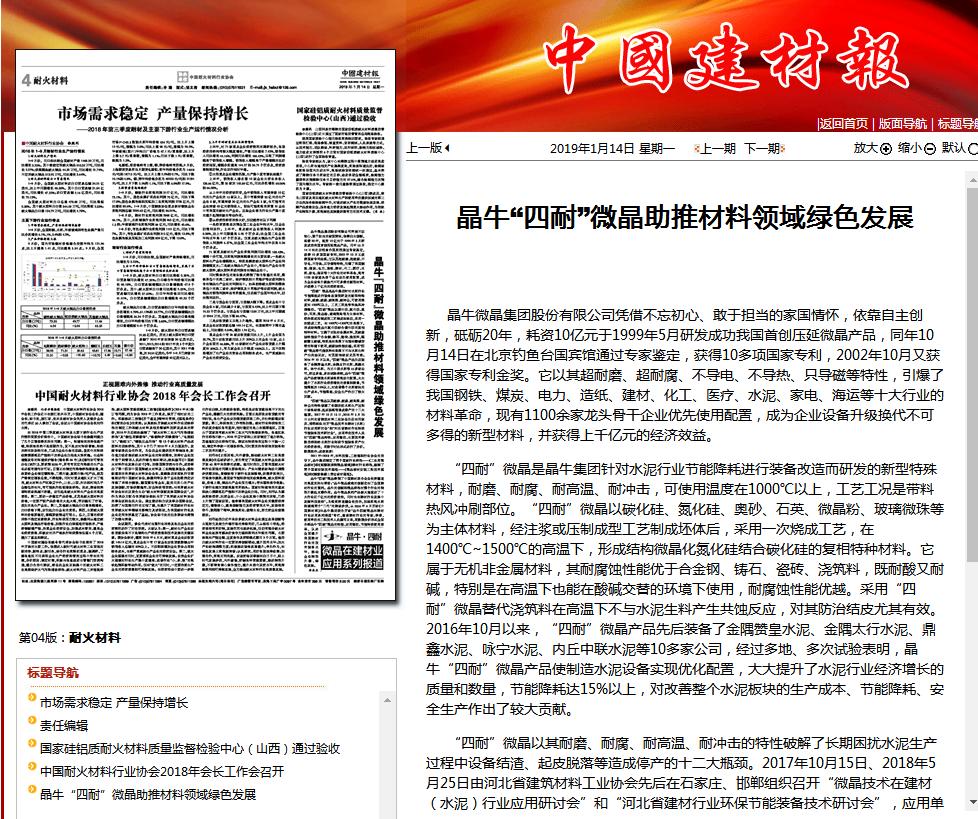 晶牛“四耐”微晶得到了中國建材聯(lián)合會會長喬德龍的高度關(guān)注與評價:“晶牛微晶玻璃的創(chuàng)新走在了全國建材行業(yè)的前列。晶牛的創(chuàng)新和微晶標(biāo)準(zhǔn)對整個行業(yè)的轉(zhuǎn)型升級起支撐作用。晶牛微晶系列產(chǎn)品極大地促進(jìn)了十大行業(yè)近千億元的經(jīng)濟(jì)效益,同時也在建材行業(yè)發(fā)展中發(fā)揮科技效益”。為落實喬龍德會長指示,加速實現(xiàn)水泥和玻璃兩個“二代”的建設(shè)步伐,從2018年9月開始《中國建材報》與晶牛集團(tuán)聯(lián)合開設(shè)“晶牛四耐微晶在建材行業(yè)應(yīng)用系列報道”專欄,邀請建材行業(yè)的專家、學(xué)者,使用單位的工程技術(shù)人員撰寫文章,用數(shù)據(jù)分析形式全面介紹晶牛“四耐”微晶的性能、應(yīng)用部位、節(jié)能使用效果,以此全面提升我國建材行業(yè)的技術(shù)裝備水平,推動企業(yè)轉(zhuǎn)型升級、綠色發(fā)展。