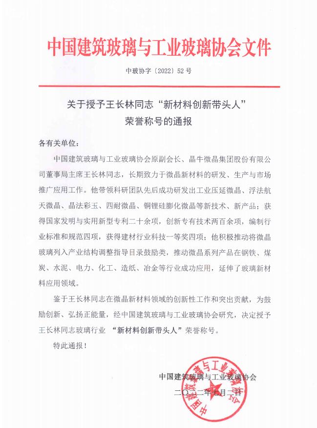關于授予王長林同志 “新材料創新帶頭人” 榮譽稱號的通報